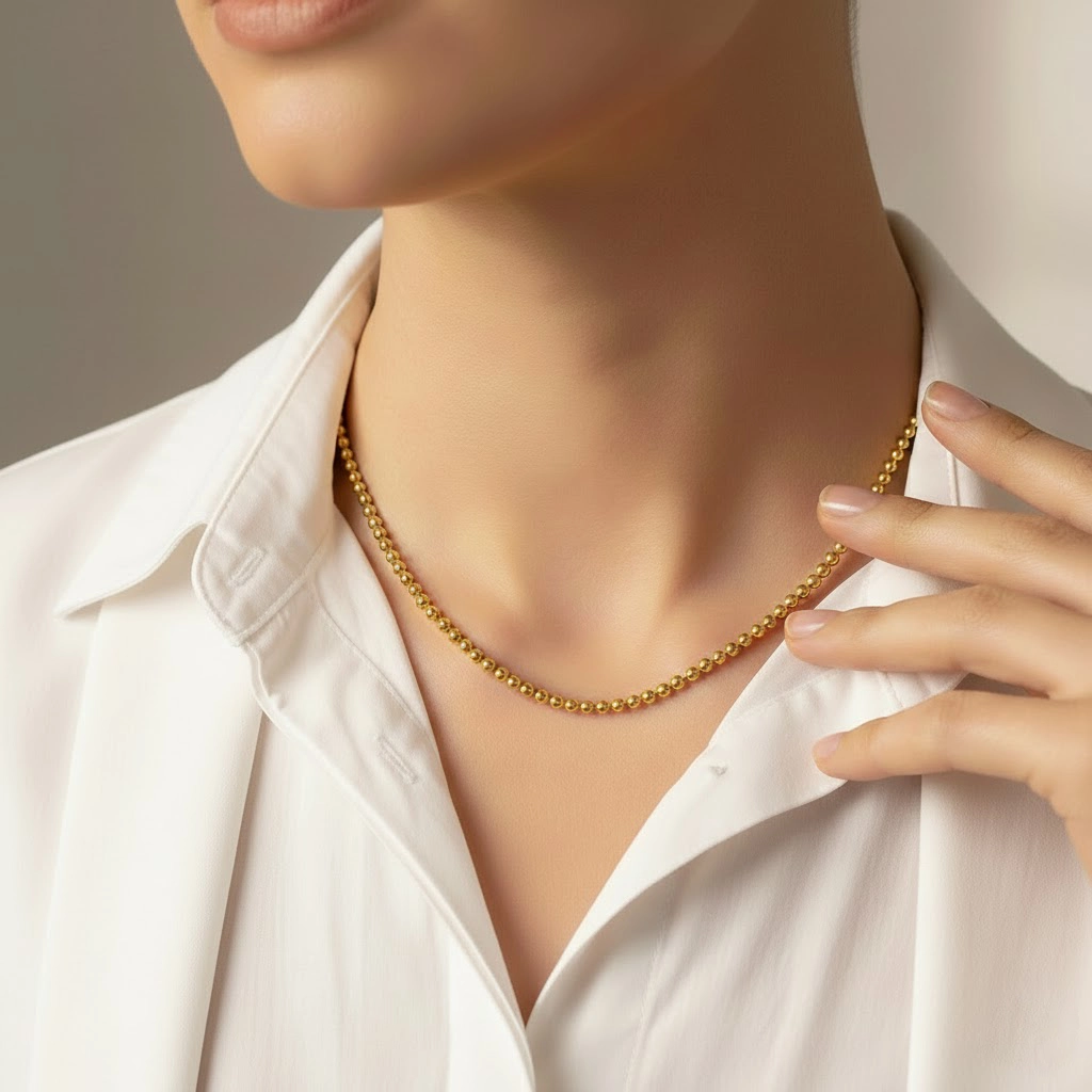 این گردنبند طلای توپی، یک انتخاب هوشمندانه برای کسانی است که زیبایی را در سادگی و ظرافت میبینند. طراحی مدرن و مینیمال این قطعه، آن را به گزینهای ایدهآل برای استفاده روزمره و یا تکمیل یک استایل شیک برای موقعیتهای خاص تبدیل کرده است. گویهای طلایی کوچک با نظمی دقیق در کنار هم قرار گرفتهاند تا درخششی ملایم و چشمنواز روی گردن شما ایجاد کنند.